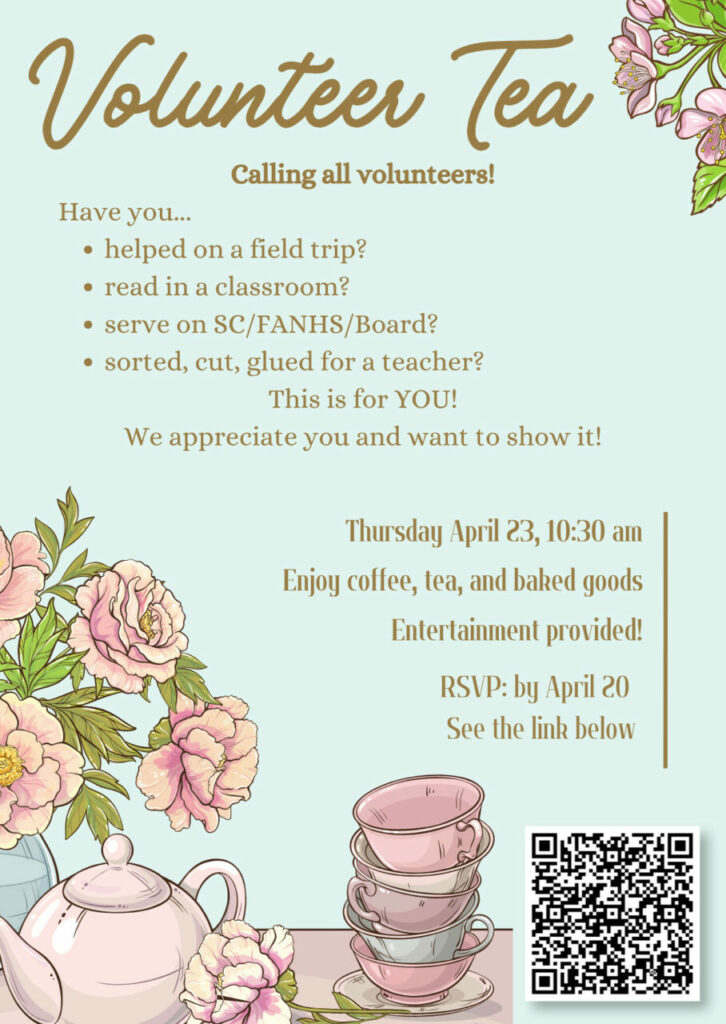 If you have attended a field trip, read a book to a class, given a presentation, have a role on School Council, FANHS, or the board, or you’ve sorted, cut, glued for school, we want to show our appreciation!